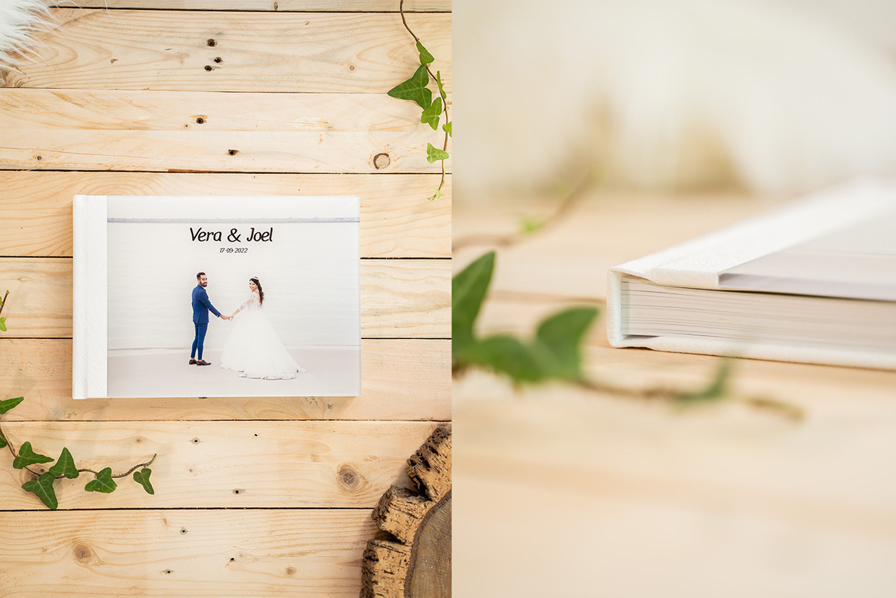 O álbum é composto por um papel fotográfico mate e inclui uma capa em acrílico com abas em pele sintética ou linho. Conforme o vosso gosto poderão escolher entre estes dois tipos de material para a capa.