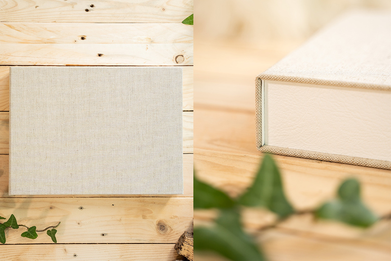 A caixa para o álbum é feita à mão com uma fita de cetim, que permite puxar o álbum sem danificar, e revestida com pele sintética, linho natural ou ambos os materiais. Poderão escolher o revestimento da caixa de acordo com o vosso gosto pessoal.